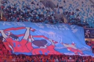 青岛德比赛前灯光摇曳,球迷制作TIFO并齐唱大海啊故乡