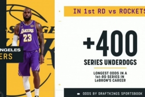 据ESPN统计,湖人首轮战胜火箭晋级的赔率为+400(投注100,若押中连本带利得500),这是詹姆斯生涯其所在球队在季后赛首轮的最差赔率。