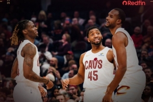 四连胜!骑士官方发布赢球海报:封面人物米切尔、莫布里和埃利斯